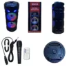 e haut-parleur sans fil super bass BT 2429 est en forme de tube avec la poignée pour transférer confortablement on peut mettre en deux positions verticale et horizentale. Il peut être utilisé manuellement par une commande. Il est caractérisé par une technologie de Connectivité sans Fil (Bluetooth), une puissance de sortie 20W, un matériel ABS, un effet LED clignotant avec lecture de musique, une batterie au lithium rechargeable 3000 mAh ayant une autonomie de 3 heures, une tension d’entrée DC 5 V, une réponse en fréquence égale à 150 Hz-18 kHz, une plage de travail allant jusqu’à 10 mètres.Cet haut parleur supporte la lecture de musique avec une carte TF / Micro SD et Radio FM.Il est disponible en noir, rouge et bleu et il est accompagné d’un câble chargeur,microphone et commande .